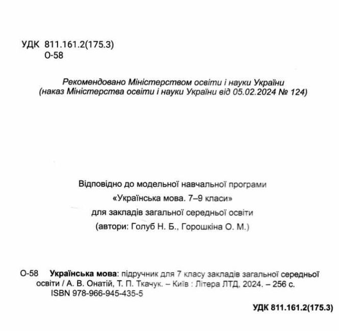 Зміст підручника з української мови для 7 класу (Онатій, Ткачук 2024 року видання) відповідає Державному стандарту загальної середньої освіти та Модельній навчальній програмі «Українська мова. 7–9 класи» для закладів загальної середньої освіти (автори: Голуб Н.Б., Горошкіна О.М.). Для учнів та учениць 7 класу.
