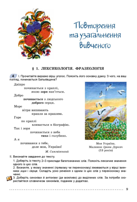 Особлива увага приділена розвитку усного та писемного мовлення, формуванню умінь аналізувати тексти, узагальнювати інформацію та використовувати її на практиці. Підручник містить вправи різного рівня складності, що допомагають закріпити правила граматики, покращити словниковий запас і підвищити мовну компетентність учнів.