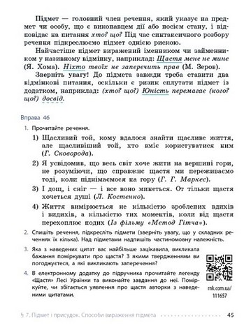 В основі підручника — збалансоване поєднання доступно викладеної нової інформації про мову із активним залученням уже здобутих знань і самостійних міркувань учнів та учениць. Вправи варіюються від простих на закріплення нових правил до творчих та дослідницьких. Тексти та завдання дібрані з увагою до зацікавлень відповідної вікової групи. У фокусі підручника — можливості практичного застосування здобутих знань у повсякденні.