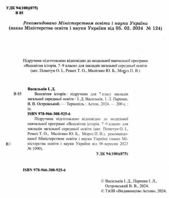 Підручник Всесвітня історія 7 клас НУШ Авт: І.Д. Васильків І.Л. Паршин В.В. Островський Вид-во: Астон 108948