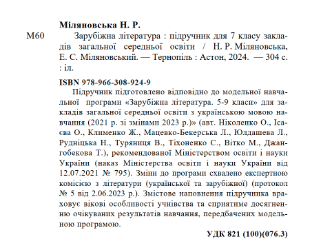 Підручник Зарубіжна література 7 клас НУШ Авт: Н.Р. Міляновська Е.С. Міляновський Вид-во: Астон 106398