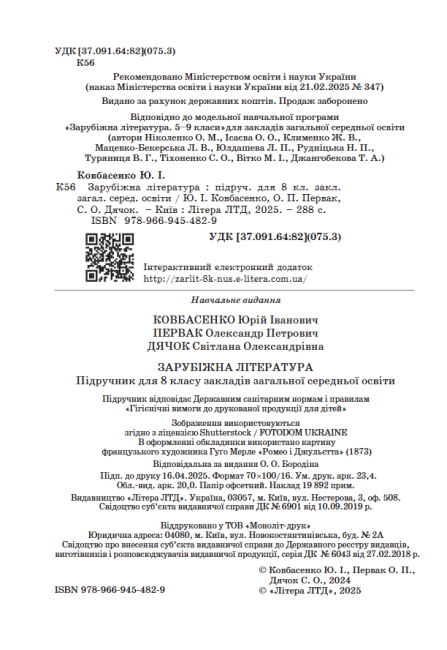 Підручник Зарубіжна література 8 клас НУШ Авт: Ю. Ковбасенко, О. Первак, С. Дячок Вид-во: Літера 111595