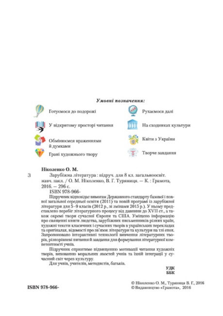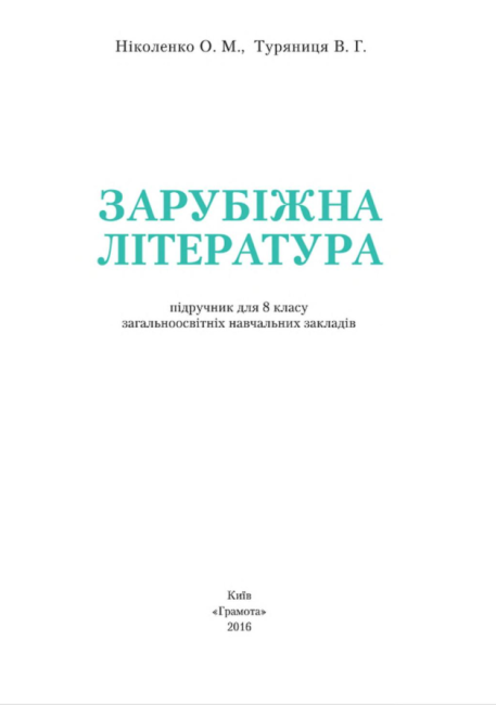 Підручник Зарубіжна література 8 клас Нова програма Авт: Ніколенко О. Туряниця В. Вид-во: Грамота 15990