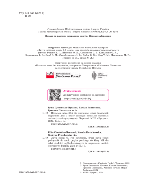 Підручник Польська мова 7 клас 3-й рік навчання НУШ Авт: Цесельська-Мусамег Р. та ін. Вид-во: Букрек 109752