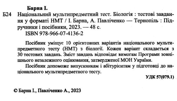 Посібник уміщує 10 орієнтовних варіантів національного мультипредметного тесту (НМТ) з біології. Кожен варіант складається з 30 тестових завдань. Зміст завдань відповідає вимогам Програми зовнішнього незалежного оцінювання, затвердженої МОН України.