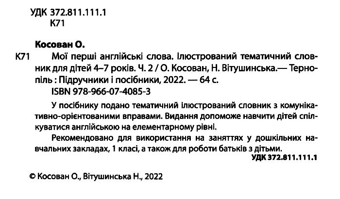 Ілюстрований тематичний словник для дітей. My first English words. Мої перші англійські слова. 4–7 років. частина 2. Косован О., Вітушинська Н. ПІП. 73371