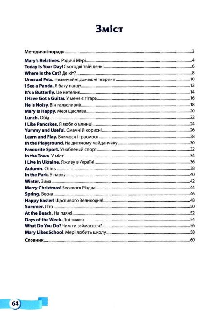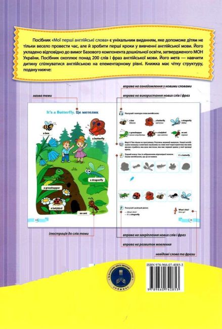 У посібнику подано тематичний ілюстрований словник з комунікативно-орієнтованими вправами. Видання допоможе навчити дітей правильно називати та описувати предмети англійською мовою, а також спілкуватися англійською на елементарному рівні. Рекомендовано для використання на заняттях у дошкільних навчальних закладах, 1 класі, а також для роботи батьків з дітьми.