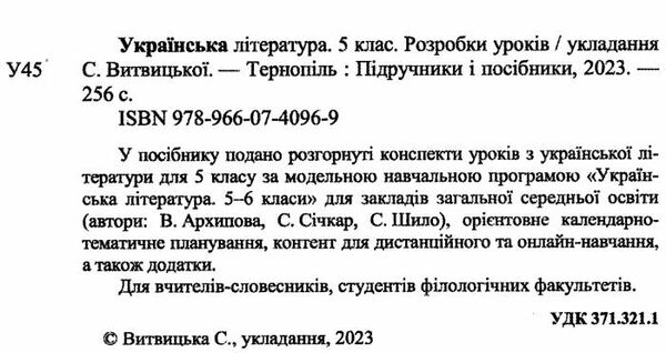 У посібнику подано розгорнуті конспекти уроків з української літератури для 5 класу за модельною навчальною програмою «Українська література. 5–6 класи» для закладів загальної середньої освіти (автори: В. Архипова, С. Січкар, С. Шило), орієнтовне календарно-тематичне планування, контент для дистанційного та онлайн-навчання, а також додатки.