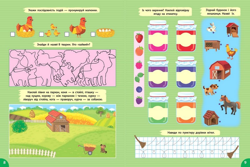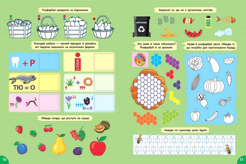На сторінках книжки «Я досліджую світ. На фермі» дитина виконає вправи на розпізнавання тварин та їхніх малят, потренується об’єднувати їх у групи, підбирати відповідні локації, будинки та улюблені смаколики; буде розрізнювати овочі, фрукти та ягоди, підбирати продукти для певних страв, установлювати послідовність подій і процесів, розгадувати ребуси, розмальовувати за підказками та наводити пунктирні лінії. Прості завдання в цікавому оформленні стимулюватимуть до пізнання і вивчення матеріалу, необхідного для дошкільняти.