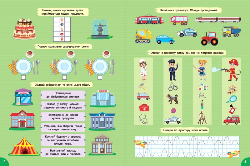 На сторінках книжки «Я досліджую світ. У місті» дитина перевірить свої знання правил дорожнього руху і дорожніх знаків, правил поведінки, спілкування та поводження в громадських місцях; потренується розрізнювати транспорт, продукти харчування, сезонний одяг, а також розуміти спільне й відмінне між ними. Дитина познайомиться з професіями, закріпить правила сортування сміття і сервірування столу, буде встановлювати послідовність подій і процесів, розмальовувати за підказками та наводити пунктирні лінії. Прості завдання в цікавому оформленні стимулюватимуть до пізнання і вивчення матеріалу, необхідного для дошкільняти.