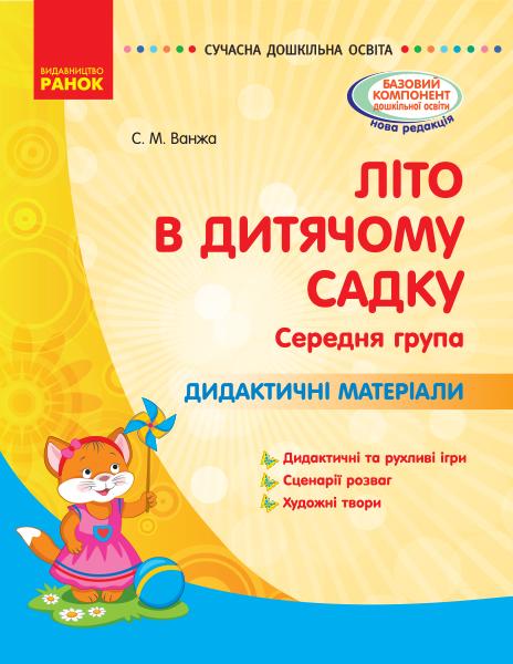Літо в дитячому садку Середня група Дидактичні матеріали Сучасна дошкільна освіта Ранок. Пропонований методичний посібник є додатком до розгорнутого календарного плану з організації навчально-виховного процесу в літній період. Він містить дидактичні та рухливіігри, добірку художніх творів відомих українських письменників та сценарії розважальних оздоровчих заходів. Видання допоможе вихователю провести цікаві та змістовні заняття, організувати веселе й корисне дозвілля у групі середнього дошкільного віку.Видання адресоване викладачам дошкільних освітніх закладів.