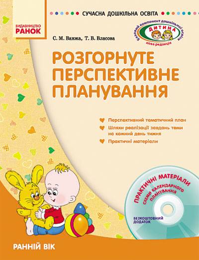 Розгорнуте перспективне планування Ранній вік Сучасна дошкільна освіта Дитина Диск Ранок. У посібнику подано розгорнутий перспективний план організації навчально-виховного процесу з дітьми раннього віку за програмою виховання і навчання дітей від двох до семи років «Дитина». У ньому визначені найбільш ефективні методи, прийоми та засоби, спрямовані на реалізацію важливих розвивальних, навчальних та виховних завдань. Матеріал розподілено за розділами програми, враховуючи різні види діяльності та індивідуальні особливості дітей певної вікової групи.Також підібрано практичний матеріал: рухливі та дидактичні ігри, художні твори, ранкові гімнастики та гімнастики пробудження.Цей посібник допоможе вихователям змістовно та цікаво організувати роботу з дітьми протягом дня.