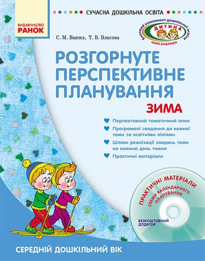 Розгорнуте перспективне планування Середній дошкільний вік Зима Сучасна дошкільна освіта Дитина Диск Ранок. Видання містить розгорнуте перспективне планування навчально-виховного процесу за програмою «Дитина», складене за блочно-тематичним принципом, оскільки він базується на інтегрованому підході до організації життєдіяльності дітей, забезпечує змістову цілісність, системність, послідовність, ускладнення та повторення програмового матеріалу протягомтематичного тижня.