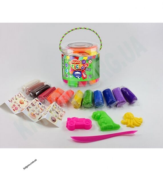 Комплект содержит: 12 цветных брикетов теста, 3 формочки, стек, инструкцию Мастер-Класс.