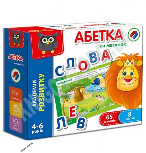 Академія розвитку Абетка на магнітах. Вивчай літери та складай слова! Король усіх звірів, хоробрий лев завітав, аби допомогти малюкові у вивченні абетки! Вік 4-6 років.