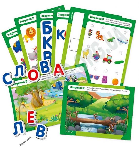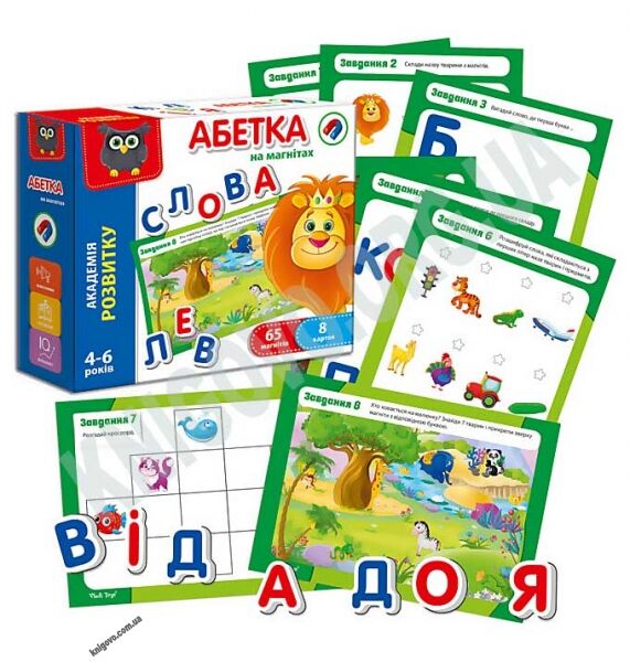 Комплектація: 65 магнітні літери, 8 карток із завданнями.