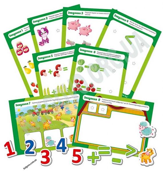 Комплектація: 56 магнітних цифр та знаків, картки із завданнями 8 шт.