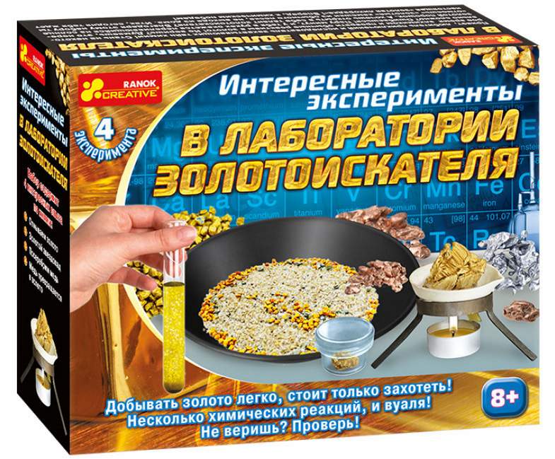 Стать алхимиком за пару часов и превратить обычные предметы в золото не только реально, но и легко! В наборе-лаборатории золотоискателя есть все необходимое для проведения экспериментов, а еще много интересных фактов о золоте. Всего лишь за пару минут можно научиться отмывать золото из обычного песка, увидеть настоящий золотой звездопад, превратить медь в золото. Набор золотоискателя станет отличным подарком для юных исследователей и любителей изучать новое, открывать научные тайны!