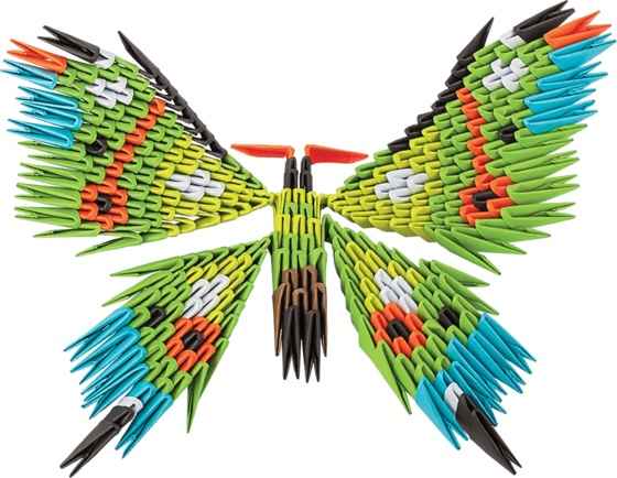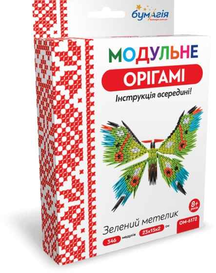 Модульне орігамі Зелений метелик 346 модулів OM-6172 Бумагія. Что такое модульное оригами? Это техника складывания из большого количества одинаковых модулей. Здесь, в отличие от классического оригами для складывания фигуры используется не один лист бумаги, а много листов. Каждый отдельный листок складывается в модуль по правилам классического оригами. Затем модули соединяются друг с другом путем вкладывания их друг в друга. За счет силы трения модули прочно держатся друг за друга. С помощью модульного оригами можно получить практически любую фигуру практически любого размера. А за счет того, что для складывания модулей можно использовать бумагу разных цветов модульные фигуры получаются по-настоящему удивительными. Каждый набор упакован в красочную коробку, в которой вы найдете: