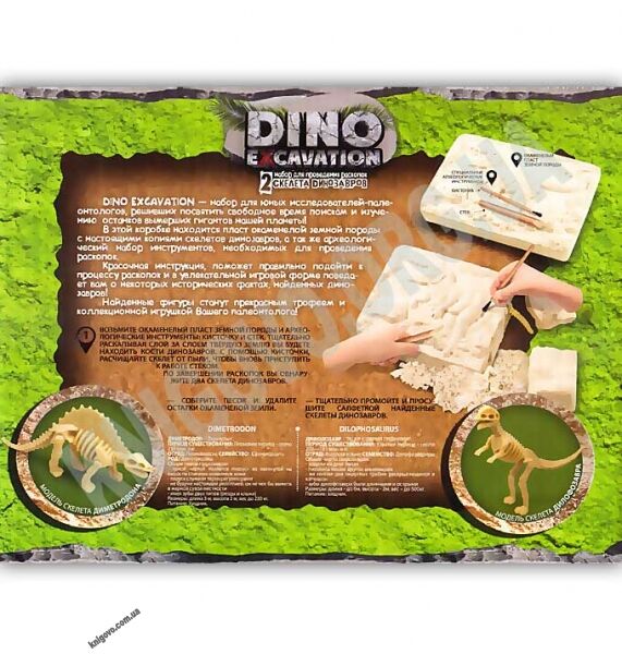 Набор для проведения раскопок Dino excavation Динозавры. Это набор для юных исследователей-палеонтологов, решивших посвятить свободное время поискам и изучению останков вымерших гигантов нашей планеты! В этой коробке находится пласт окаменелой земной породы с настоящими копиями скелетов динозавров, а так же археологический набор инструментов, необходимых для проведения раскопок. В наборе 2 скелета.