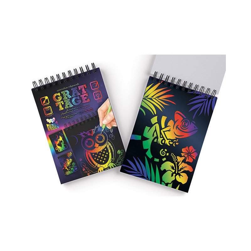 Граттаж - это способ выполнения картины, методом процарапования изображения на картоне острым инструментом. Рисунки выполнены в технике граттаж отличаются контрастом ярких линий и черного фона, похожие на гравюры. Специальный слой, хаотично окрашен в радужные цвета, покрытый защитной краской. Снимая штихелем слой защитной краски появляется яркий и оригинальный рисунок! Блокнот содержит ТРИ заготовки с контурами и ТРИ заготовки для Ваших индивидуальных и творческих открытий.
