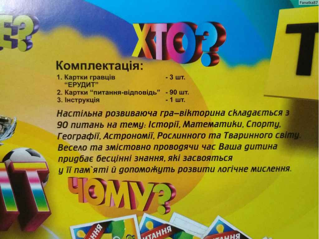 Настільна розвиваюча гра-вікторина Ерудит Код: DTG 25 Danko Toys складається з 90 питань на тему географії, історії, математики, астрономії, спорту, флори і фауни.