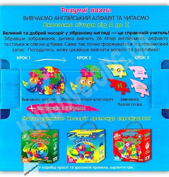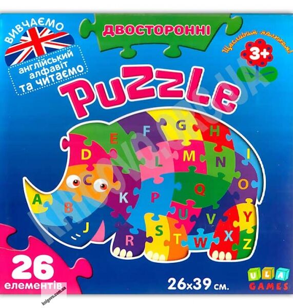 Двосторонні пазли Вивчаємо англійський алфавіт та читаємо призначені для малюків від 3-х років. Вони спрямовані на розвиток уваги, логічного та образного мислення. Гра полягає в тому, що зібравши великий пазл у вигляді носорога, дитина вивчить англійські літери та слова на ці букви.