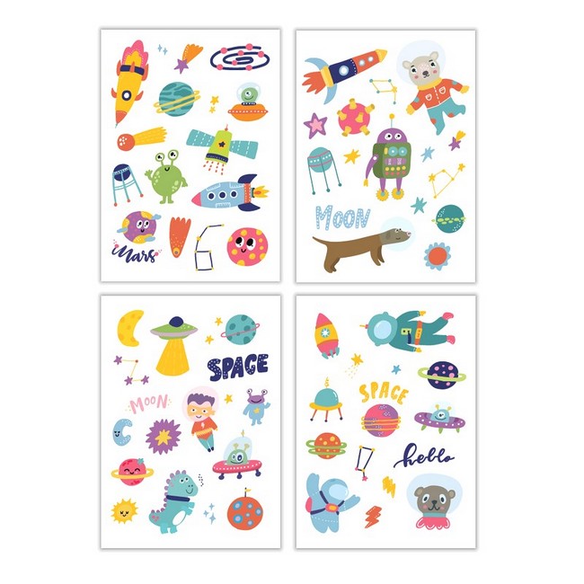 Набір татуювань містить чотири аркуша з милими картинками, які дуже прості у використанні. Усі ілюстрації якісні та оригінальні.