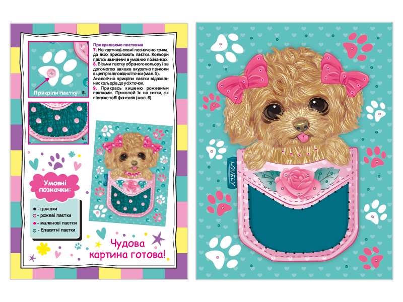 Процес створення незвичайної картинки захопить як дітей, так і дорослих, адже він водночас простий і неймовірно цікавий: розміщуємо цвяшки на кольорову схему-картинку і натягуємо нитки відповідно до схеми, потім прикрашаємо кольоровими паєтками.