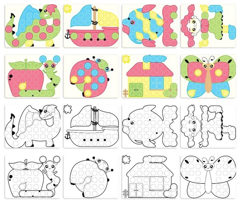 • Малюк зможе створювати картини за зразками - рибка, метелик, кораблик, яблучко з черв'ячком і інші, або вигадувати власні сюжети