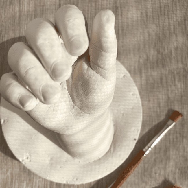 - Перемішайте скульптурний порошок з водою. Залийте суміш в контейнер, де Ви робили форму ваших рук та залишіть на 40 хвилин