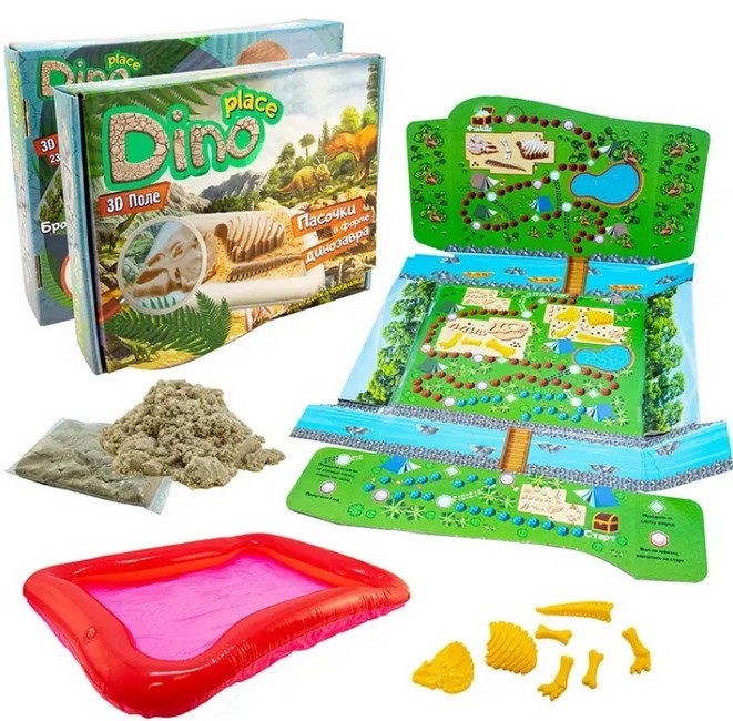 Кидай кубик і просуваючись по джунглях, збирай частини, з яких можна зібрати фігурку динозавра – хто перший виконає завдання, отримає титул головного палеонтолога! Перед початком гри необхідно підготуватися: на 3D ігровому полі розмістити частини динозаврів. Для їх виготовлення в наборі є кінетичний пісок і формочки.