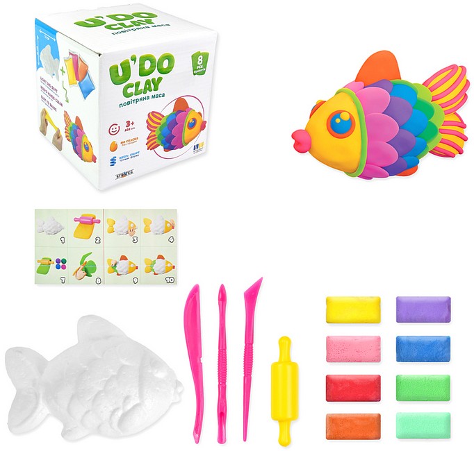 Набір для творчості U'DO Clay — легка повітряна маса для ліплення, що створена для маленьких творців від 3 років. У комплекті 8 брикетів по 10 грамів і пінопластова фігурка для декору. Маса приємна на дотик, не липне до рук, легко змішується та зберігає форму після висихання. Ідеально підходить для перших кроків у творчості вдома чи в дитячому садочку. Розвиває фантазію, координацію та любов до створення власноруч.