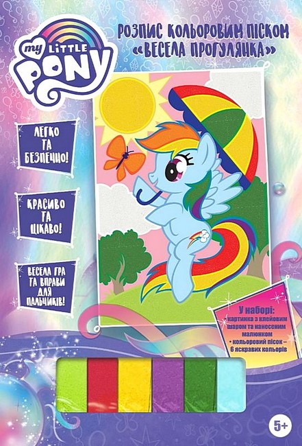 Розпис кольоровим піском My Little Pony – це відмінний засіб надовго захопити дитину, розвиваючи у неї тонку пальцеву моторику, колірне та тактильне сприйняття, увагу, сприйняття частини і цілого, посидючість і акуратність.