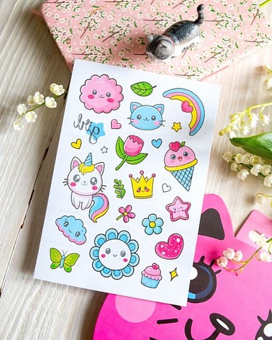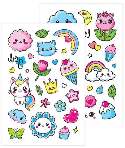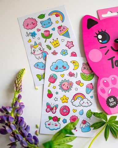 Тимчасові тату для дівчаток молодшого віку! Набір яскравих тимчасових татуювань у чарівному пакуванні у формі рожевого котика — справжня знахідка для маленьких модниць! Всередині — 2 аркуші з понад 50 стильними тату: хмаринки з оченятами, веселки, квіточки, морозиво, пончики, котоєдиноріжки, метелики, коронки, тістечка та модні надписи.
