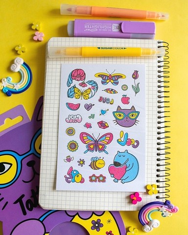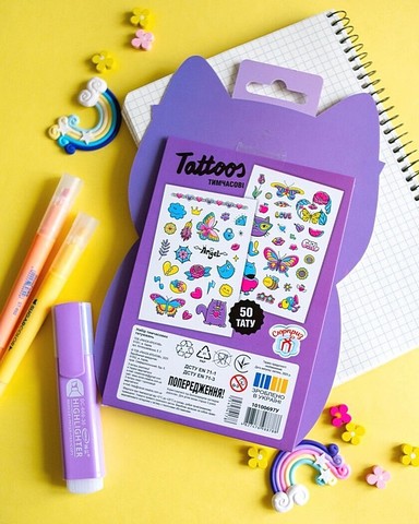 Стильний набір яскравих татуювань у веселому пакуванні у формі фіолетового котика в окулярах — ідеальний подарунок для модних дівчаток! У комплекті 2 аркуші з понад 50 тимчасових тату: блискучі діаманти, милі мордочки котиків, смайлики, сердечка-ланцюжки, метелики в стилі бохо, модні надписи та багато інших.