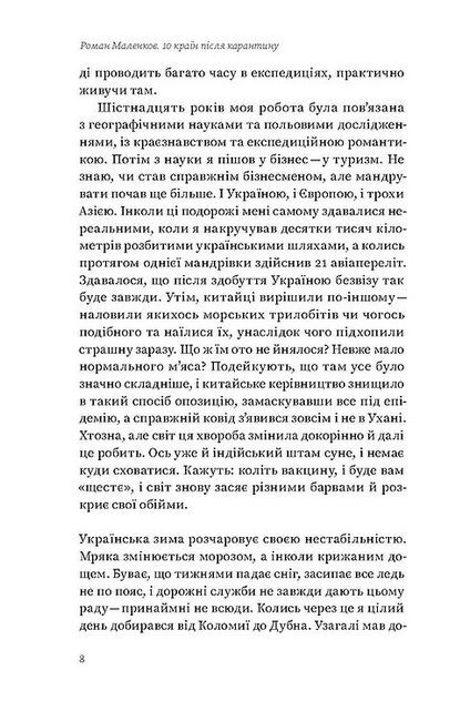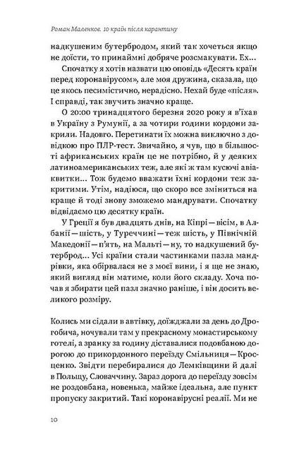 У цій книжці ви знайдете підказку, куди податися, щойно відкриють кордони. Географ і мандрівник Роман Маленков зібрав 10 країн, які, на його думку, варто відвідати після карантину. Перед нами постають Словаччина, Албанія, Греція, Мальта, Чехія, Туреччина й інші країни, які особливо вразили мандрівника і куди він обов’язково повернеться. Автор розповідає про свої подорожі, звертаючи увагу на місця, які варто відвідати, та речі, які обов’язково треба зробити, щоб відчути й побачити країну, а не лише поставити «пташку», що ви там були. Отже, готуймося до подорожі!