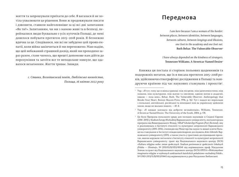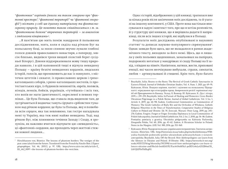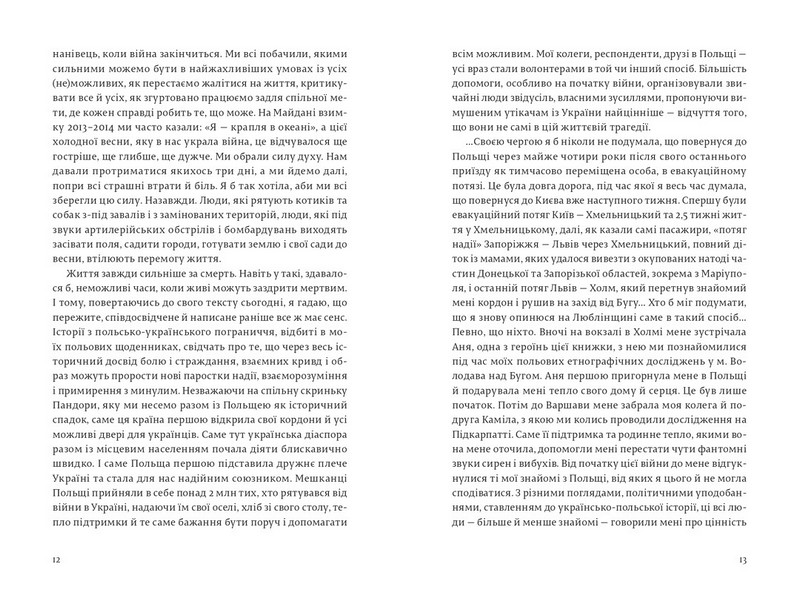 Ця книжка — своєрідний антропологічний репортаж. Вона укладена зі сторінок авторських польових етнографічних щоденників і подорожніх нотаток, зроблених під час мандрівки Польщею протягом 2015 - 2018 років. Кожна частина книжки — особиста історія зі щоденного життя людей на різних сторонах пограниччя: адміністративних, конфесійних, етнічних, уявних, фантомних тощо. Ці історії показують, що реальність щоденного життя в локальних спільнотах на периферії виявляється значно складнішою за офіційні візії національних історій у сусідніх державах. Голоси ж (не)звичайних людей, натяки, почуття, напівтони й мовчання, що складають тонку й вразливу тканину людського повсякдення, часто невидимі й незрозумілі. Ця книжка є спробою розповісти про цих людей та про виклики, з якими вони живуть щодня, і вона покликана навчити нас бути більш терпимими, більш відкритими до інакшості, до розмов про спільне неподолане минуле, до багатоголосся.