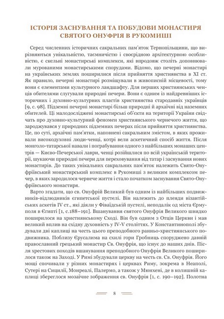 Книжку присвячено одному з найдавніших духовних осередків Тернопільщини – колишньому монастирському, а нині храмовому комплексові Святого Онуфрія в Рукомиші на Бучаччині. У книжці висвітлено історію виникнення та побудови монастиря Святого Онуфрія в Рукомиші. За картографічними матеріалами та літературними джерелами простежено еволюцію розвитку сакрального комплексу від існування як монастиря, його занепаду до відновлення як парафіяльного храмового комплексу. Проаналізовано архітектурно-планувальну й композиційну структури Свято-Онуфріївського комплексу та сучасні тенденції відтворення архітектурних елементів і благоустрою території. Видання призначене для архітекторів, мистецтвознавців та широкого кола читачів.