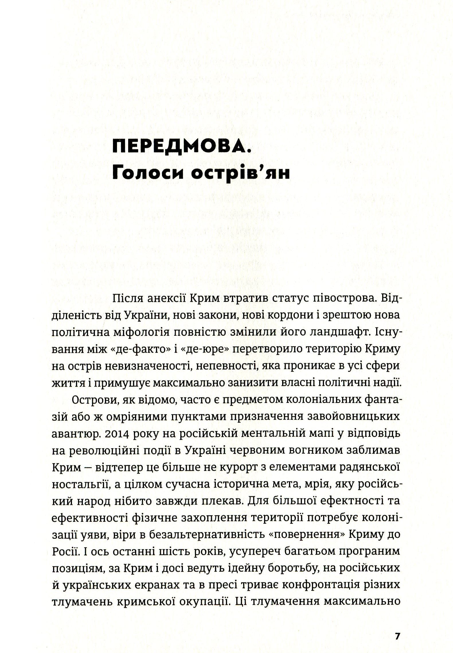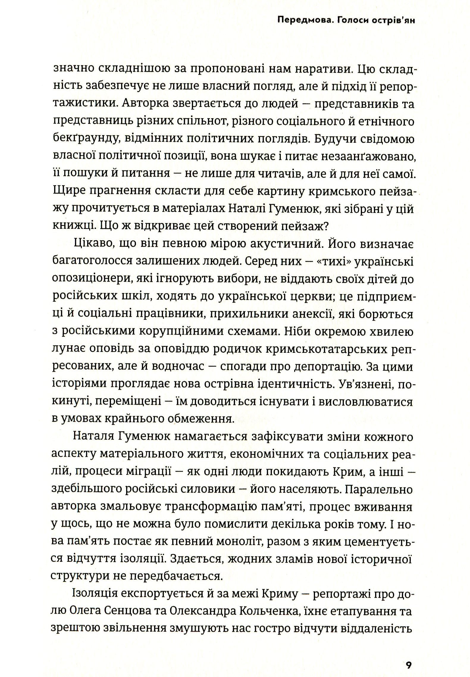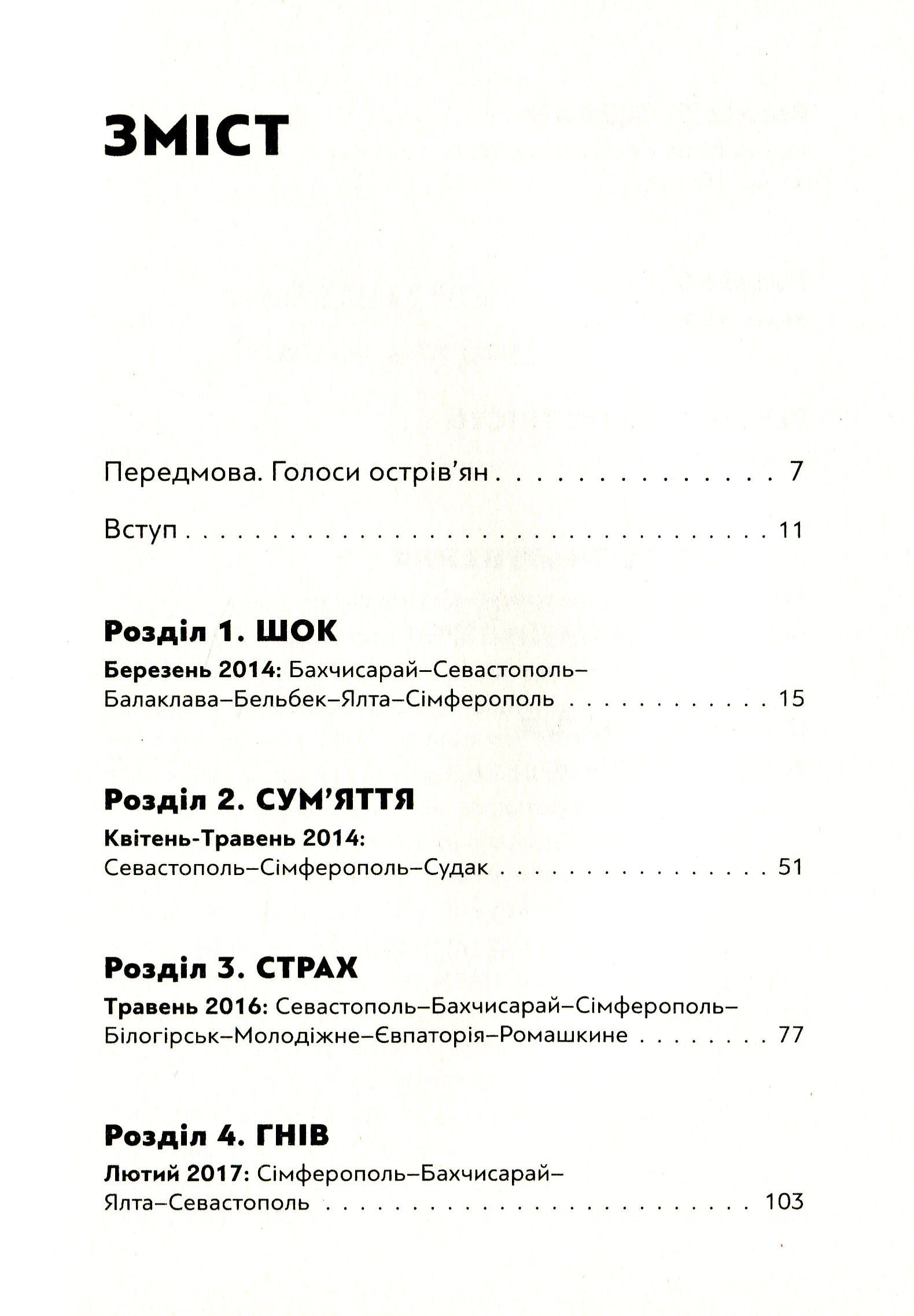 Ця книжка є справжнім голосом анексованого Криму, його багатоголоссям, в якому окремі розповіді творять єдину спільну історію, яка ще не завершилася.