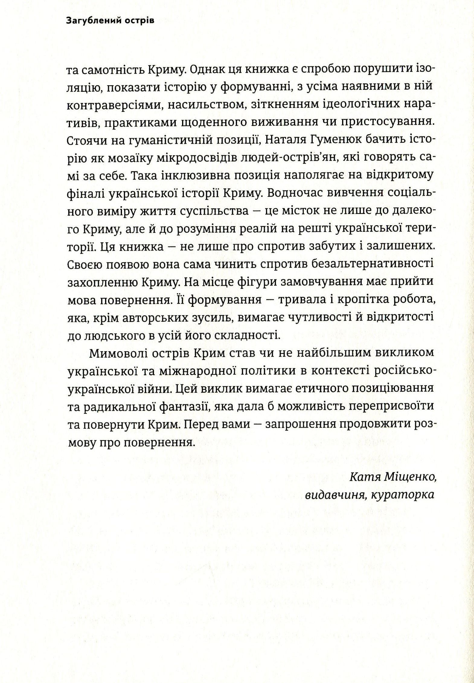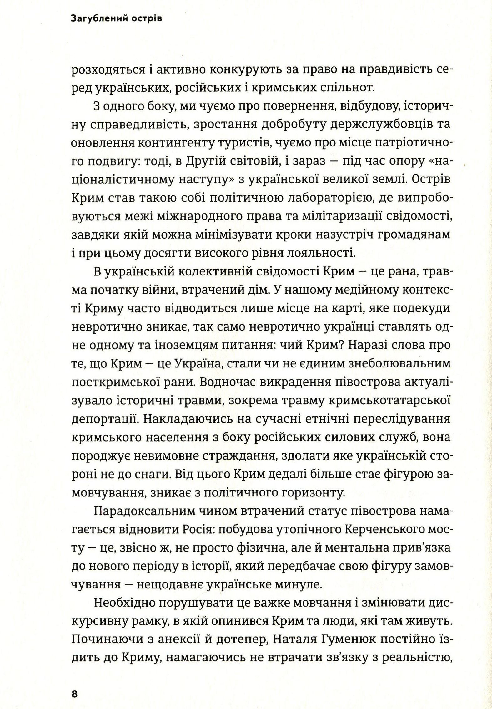 Загублений острів — це збірка репортажів з окупованого Криму, куди відома журналістка Наталя Гуменюк їздила упродовж 2014–2019 рр. У книжці — справжні історії і трагедії людей, життя яких кардинально змінилося після 2014 року, бо відтоді хтось із кримчан живе в окупації, а хтось — просто в іншій країні. То ж яка їхня неприхована правда? Підприємці та пенсіонери, кримські татари, студенти й громадські активісти, правозахисники та військові, люди з різними політичними та ідеологічними поглядами відверто розповідають свої історії: одні діляться тихим, глухим болем, інші — просто втомилися мовчати й боятися.