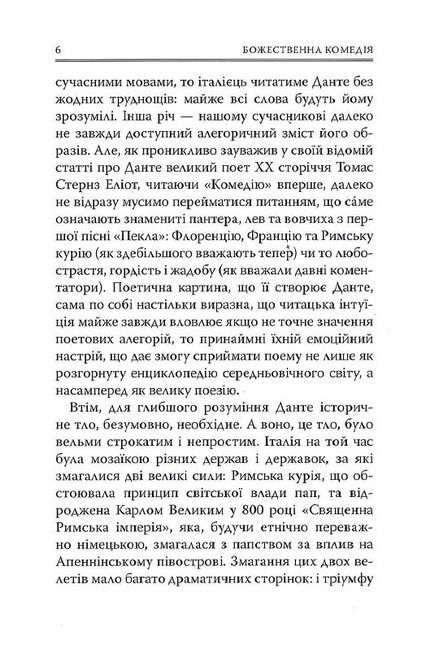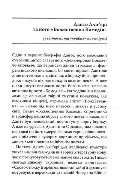 Водночас ця книга має стати для сучасного читача справжнім путівником у світ великого Данте. Вона містить докладну передмову, присвячену життю й творчості італійського поета, а також — впливу «Божественної Комедії» на розвиток української літератури. А додана до перекладу антологія пов’язаних із постаттю Данте українських віршів, написаних упродовж останніх понад півтораста років, наочно демонструє, що Україна булла і є частиною культурної Європи.