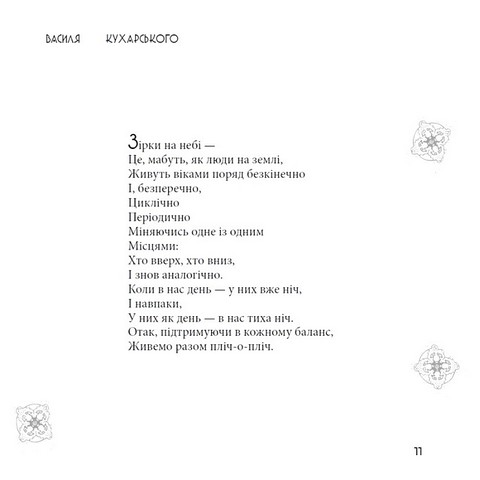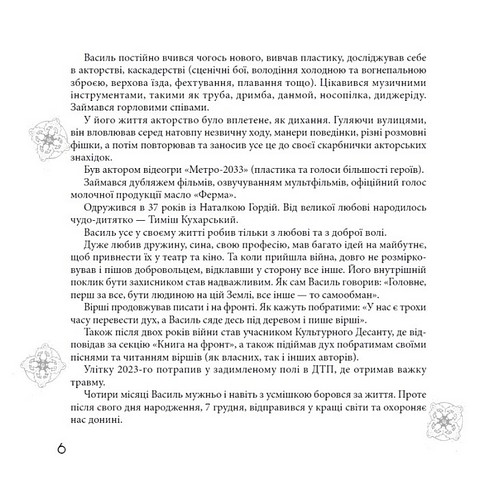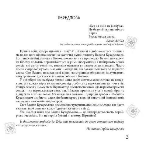 Що ми залишаємо після себе? Ця книга — не просто збірка віршів. Це інтимний світ Василя Кухарського, зафіксований у словах, світлинах та сенсах. Тут, на сторінках, живуть Його усмішки й сум, вагання та любов, жарти й війна, ніжність і невловима істина, а понад усе — пристрасть до життя та кохання. Його вірші народжувалися вночі й відлітали у світ із першим променем сонця. Кожне слово, кожен знімок наповнені сутністю ВасіКуха — живою, справжньою, нефальшивою. Все тут дихає Ним.