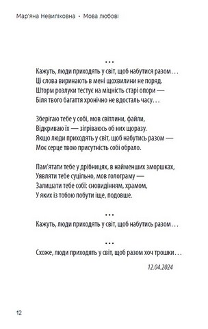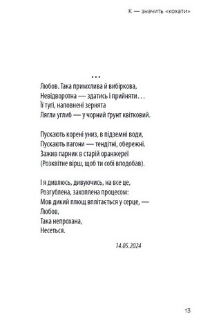 Усі вірші у збірці розташовано в хронічному порядку — через 5 основних («хронічних») тем у творчості цієї авторки: кохання, межа, внутрішня інвентаризація, гартування війною та не-порно. Збірка поєднує поезії, написані з 2012 по 2024 рік, переповідаючи тим самим віршовану третину життя авторки.