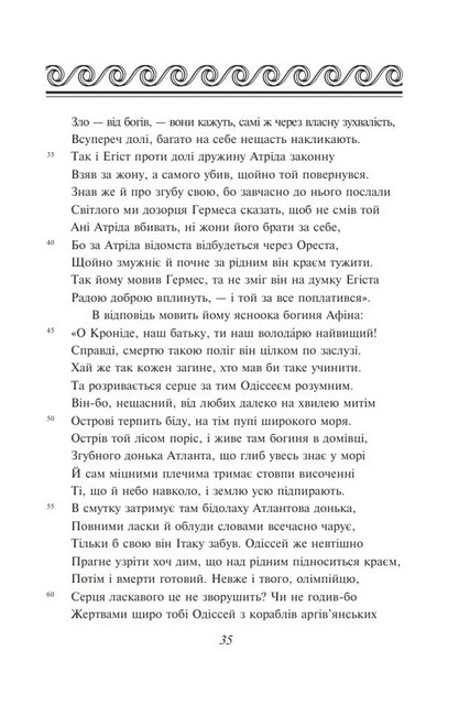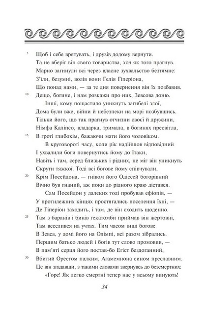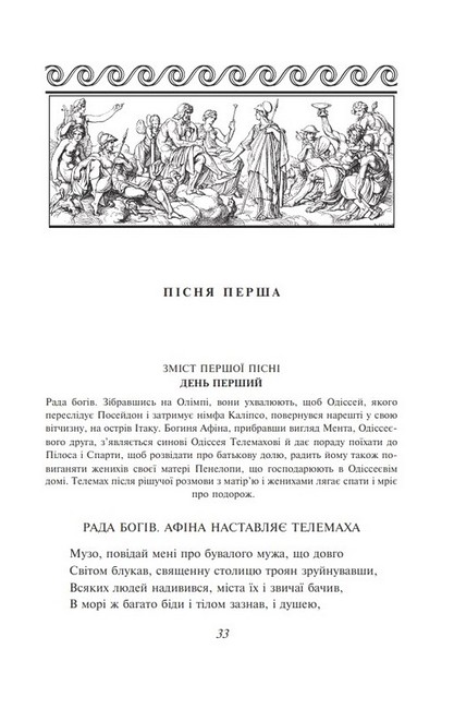 «Одіссея» оповідає про повернення велемудрого Одіссея — одного з героїв Троянської війни — на рідний острів Ітаку, де його чекали дружина Пенелопа та син Телемах, про незвичайні пригоди, які довелося пережити Одіссею на шляху додому, та про реальні та фантастичні землі, де він побував. Поема змальовує цікаві побутово-звичаєві картини із життя стародавніх еллінів і разом з тим вводить читачів у казково-фантастичний світ грецької міфології. «Одіссея» дихає урочистим спокоєм і, сповнена духовної краси і величі, є завершеним втіленням класичної епопеї.