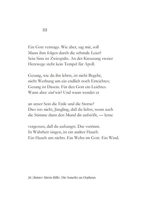 П’ятдесят п’ять сонетів, що належать до класики світової літератури. Їх Рільке написав у лютому 1922 року, коли мешкав у швейцарському замку Мюзо. У підзаголовку сонетів Рільке зазначає, що вони — надгробний пам’ятник для Вери Окама Кнопп. Ця дівчина була донькою товаришки Рільке, танцівницею і померла від лейкемії у віці вісімнадцяти років. Сонети до Орфея сповнені античних мотивів, зокрема ремінісценцій до міту про Орфея і Еврідіку. Водночас у них звучать рефлексії поета щодо його сучасности, модерної доби.