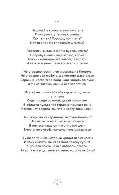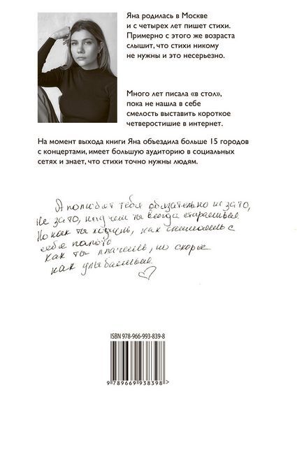 «А полюблять тебе обов'язково за інше, за те, що чужому і невтямки». Світло в її віршах знайшли десятки тисяч людей. Її цитують в інтернеті. Її тексти виконують співаки. У неї більш ніж 100 000 підписників у Instagram. А сама Яна Мкр скромно називає себе не поетесою, а «людиною, що пише». І не писати не може, адже кожен рядок — це щиросердечна сповідь про те, що неможливо утримати всередині. Може, тому серед шанувальників її творчості такі різні люди. Прямолінійна і ніжна, романтична і вольова, дівчина з м'яким серцем і залізним характером. Різна, але завжди щира. Її вірші про любов і свободу бути собою кожну секунду життя. «Якщо не знаєш, що дати іншому на цьому складному шляху, просто стій і світи. Стій і світи».