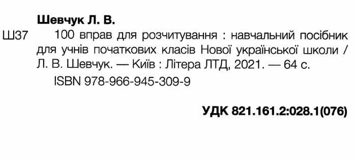 Навчальний посібник 100 вправ для розчитування 1-4 клас НУШ Авт: Шевчук Л.В. Вид-во: Літера 65795