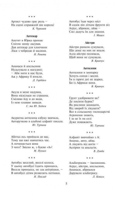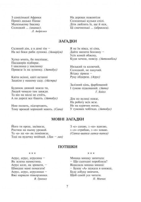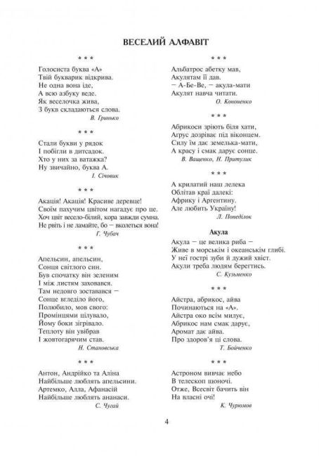 У посібнику вміщено вірші, загадки, скоромовки, чистомовки, потішки, ребуси, прислів’я та приказки до всіх букв української абетки. Збірник можна використовувати на уроках навчання грамоти, у позакласній роботі, а також у сімейному колі. Зміст посібника відповідає Державному стандарту початкової освіти, типовим освітнім програмам та чинним підручникам.