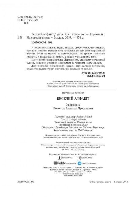 Навчання грамоти Хрестоматія Веселий алфавіт НУШ Авт: Кононюк А. Вид: Богдан